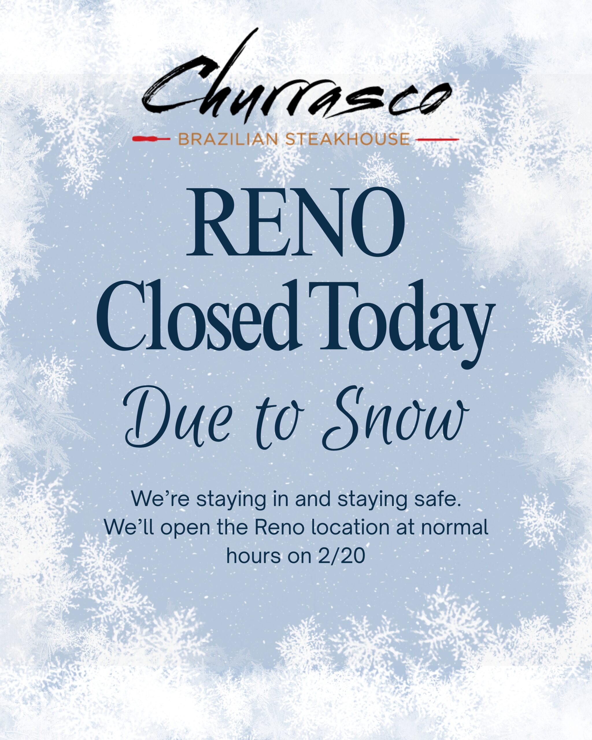Reno location closed today 2/19/26 due to snow.