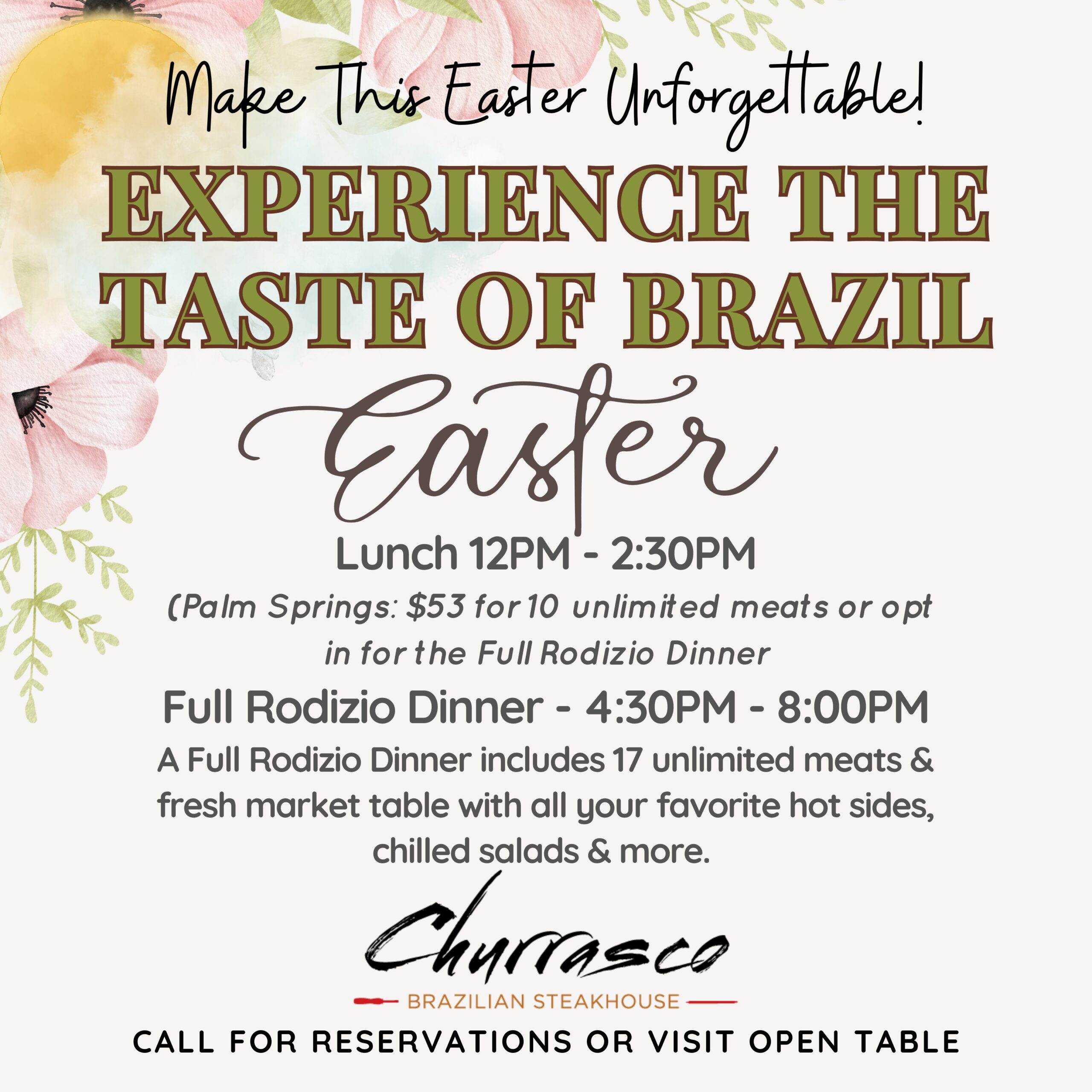 Churrasco Brazilian Steakhouse in Palm Springs is now open 7 nights a week. We invite you to come in and enjoy an unforgettable traditional Brazilian steakhouse experience through our chef-driven cuisine, world-class full bar, and unparalleled hospitality. At Churrasco, guests are surrounded in an energetic and luxurious atmosphere. We offer seating for up to 120 inside with a patio for outside dining as well for up to 36 guests. Make your reservations today! We look forward to serving you!